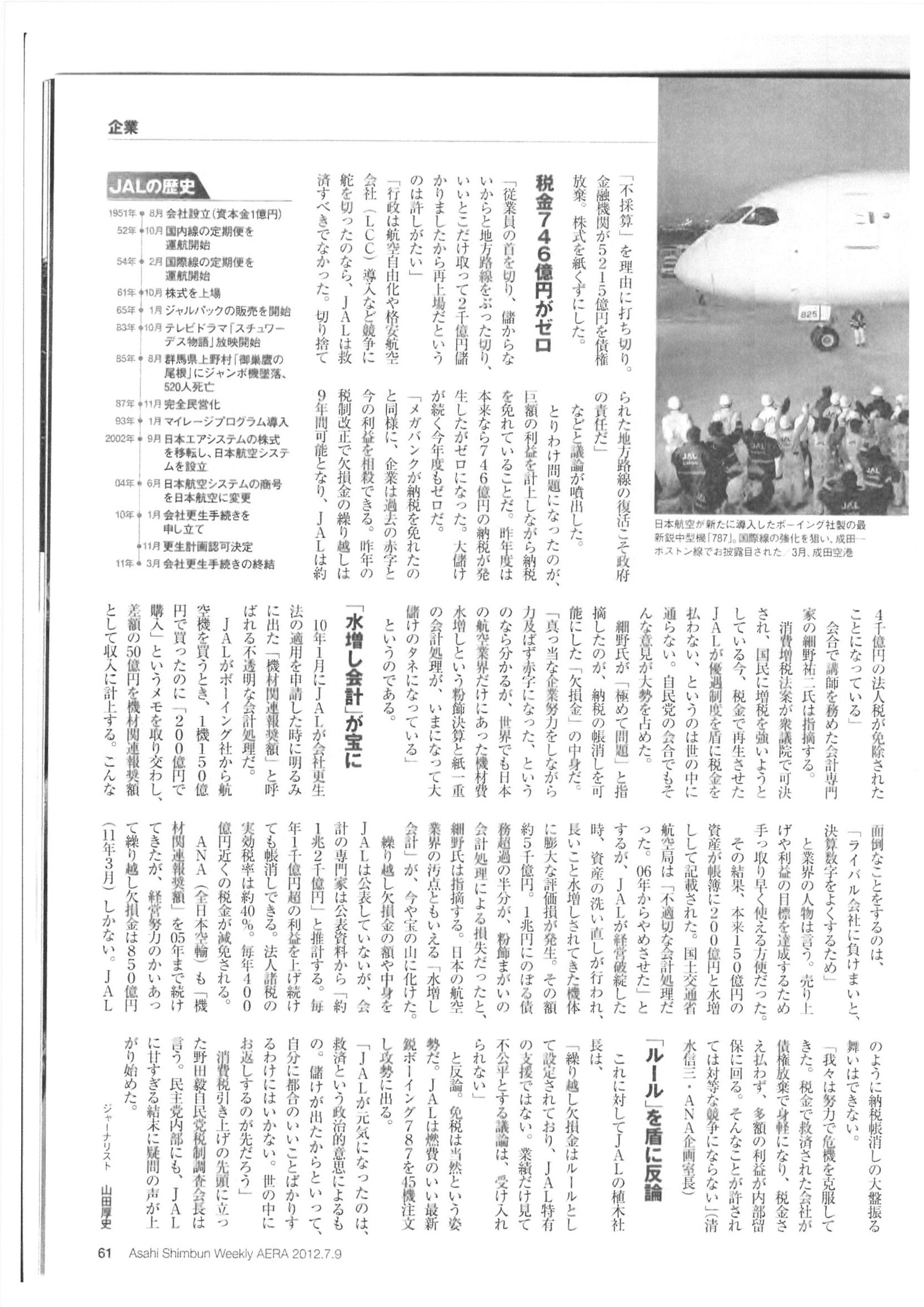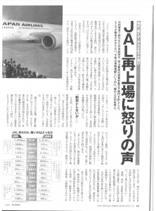 B-787などの新機材増強の費用は、一機150億円単位ですから、2000~4000億円の資金調達が必要です。放漫経営の果てに破綻した責任を誰も取らずにうやむやにして公的資金3500億円を受けているうえ、銀行の債権放棄5200億円を得ているJALは、今年度「1890億円の利益を上げています。また、累積赤字のおかげで今年度350億円の法人税も免除されている中で、9月再上場して資金調達するという話もでてきています。(下は「週刊アエラ」)