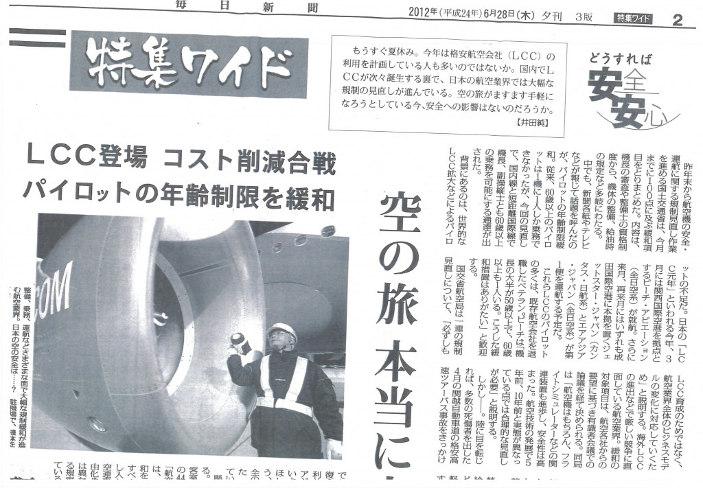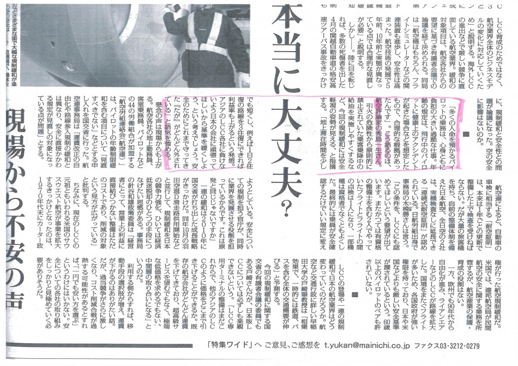 この点については、毎日新聞6月28日付夕刊の特集ワイド「どうすれば安全安心」「空の旅本当に大丈夫?」に「安全規制緩和は安全軽視の姿勢」とコメント致しました。